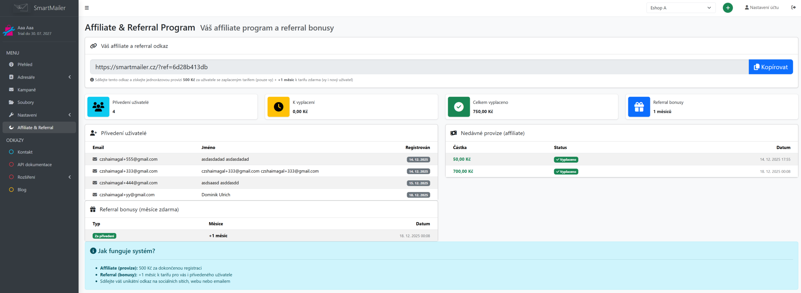Nyní ve Vaší SmartMailer administraci naleznete novou sekci „Affiliate & Referral Program“, kde naleznete Váš unikátní odkaz, který můžete sdílet kdekoliv – email, diskuze, WhatsApp, …