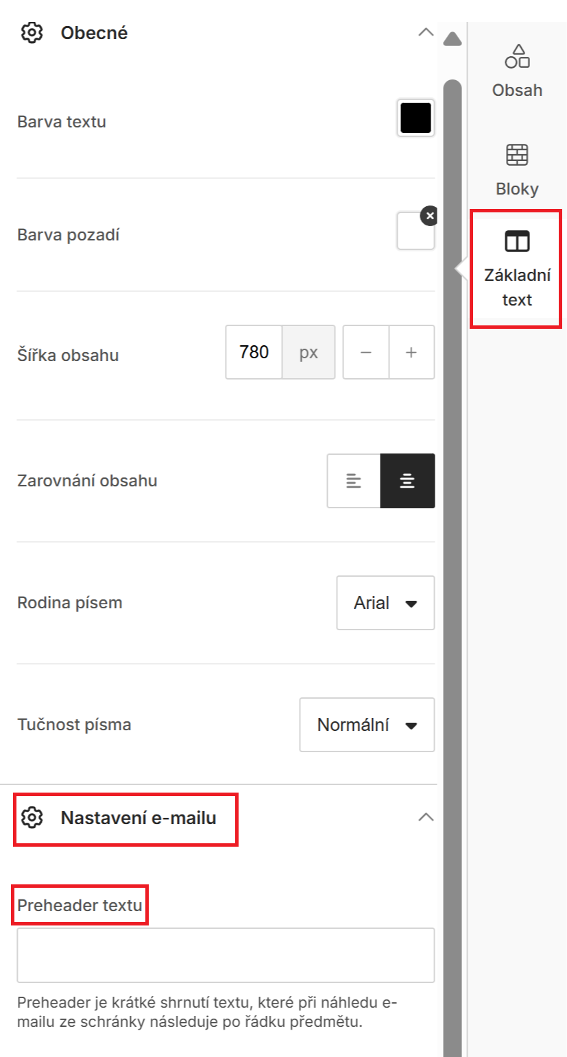 V editaci/tvorbě kampaně klikněte na „Základní text“ -> „Nastavení e-mailu“ -> „Preheader textu“