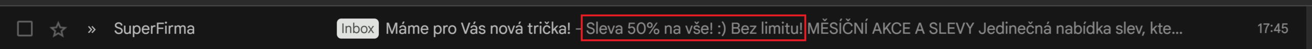 - Buduje důvěru – čitelný, srozumitelný a neklamavý preheader pomáhá, aby váš e-mail neskončil ve spamu.