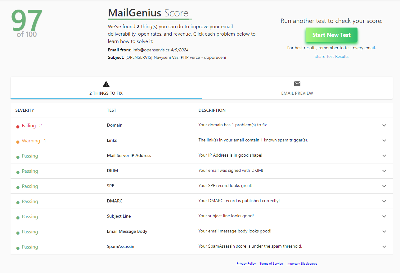 U mailgenius.com, máme „pouze“ 97 bodů a to proto, že: